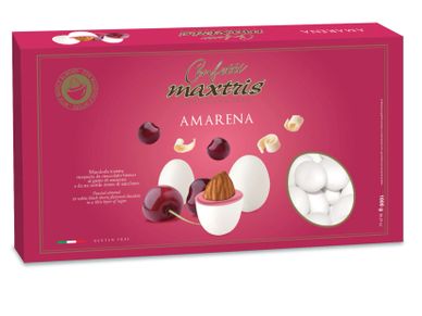 Toasted almond wrapped in a first layer of black cherry flavored white chocolate and a second layer of dark chocolate, covered with a thin layer of sugar.