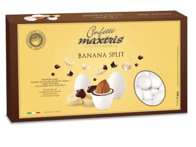 Toasted almond covered with banana-flavored dark and white chocolate and a thin layer of sugar.