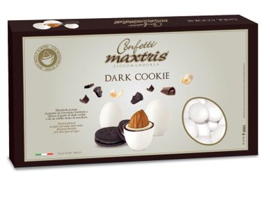 Toasted almond wrapped in a layer of dark chocolate and a layer of dark cookie-flavored white chocolate, covered with a very thin layer of sugar.