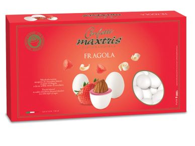 Toasted almond covered with raspberry and vanilla flavored white chocolate and a thin layer of sugar.