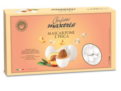 Toasted almond covered with mascarpone and peach flavored white chocolate and a thin layer of sugar.