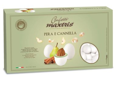 Toasted almond covered with pear and cinnamon flavored white chocolate and a thin layer of sugar.
