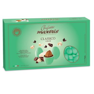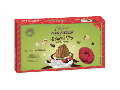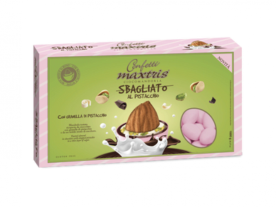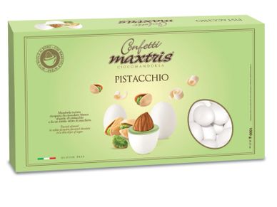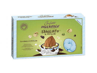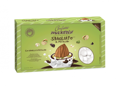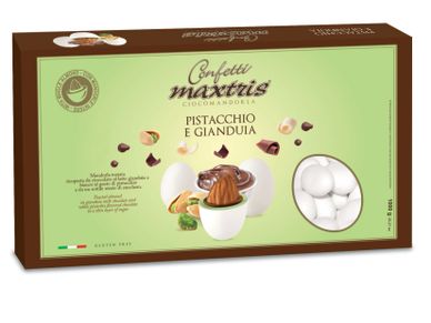 Toasted almond covered with gianduia and white milk chocolate with pistachio flavor and a thin layer of sugar.