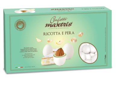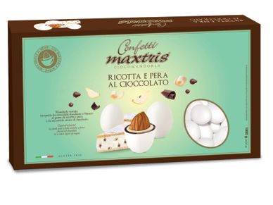 Toasted almond wrapped in a first layer of dark chocolate and a second layer of white chocolate flavored with ricotta and pear cake, covered with a thin layer of sugar.