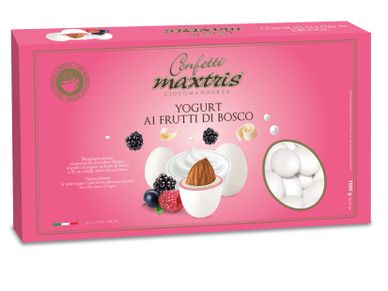 Toasted almond covered with white chocolate yogurt with berries and a thin layer of sugar.